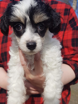 Våra små valpar börjar bli stora. 6½ vecka - redan! Vi njuter så av att få ha dessa små underverk. Mycket kel och gos blir det. Det är inte ovanligt att man blir sittande och tittar på dom å helt glömmer tid och rum. Alla 5 blir mer och mer sociala, vecka för vecka. Valparna har bestämt sig för att torra pellets smakar bättre än uppblötta. Husses små smakprov av färskfoder är dock favoritmaten. I påskhelgen har det varit ganska så mycket folk hos oss. Allt från barnbarn till mattes barn och mattes föräldrar. Valparna är precis lika glada för alla som kommer och hälsar på. Idag fick valparna gå ut för första gången. Det är lite senare än vanligt men då temperaturen varit lite låg och vindarna kalla, så har vi väntat. Nu börjar det dock vara dags att ta steget ut. Utan att använda alltför stora ord, så kan vi väl säga att det var en helt ny värld som öppnade sig, för valparna.
